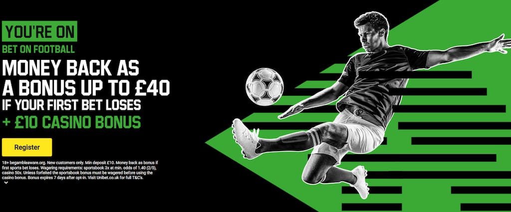 18+ begambleaware.org. New customers only. Min deposit £10. Money back as bonus if first sports bet loses. Wagering requirements: sportsbook 3x at min. odds of 1.40 (2/5), casino 50x. Unless forfeited the sportsbook bonus must be wagered before using the casino bonus. Bonus expires 7 days after opt-in. Visit Unibet.co.uk for full T&C’s.