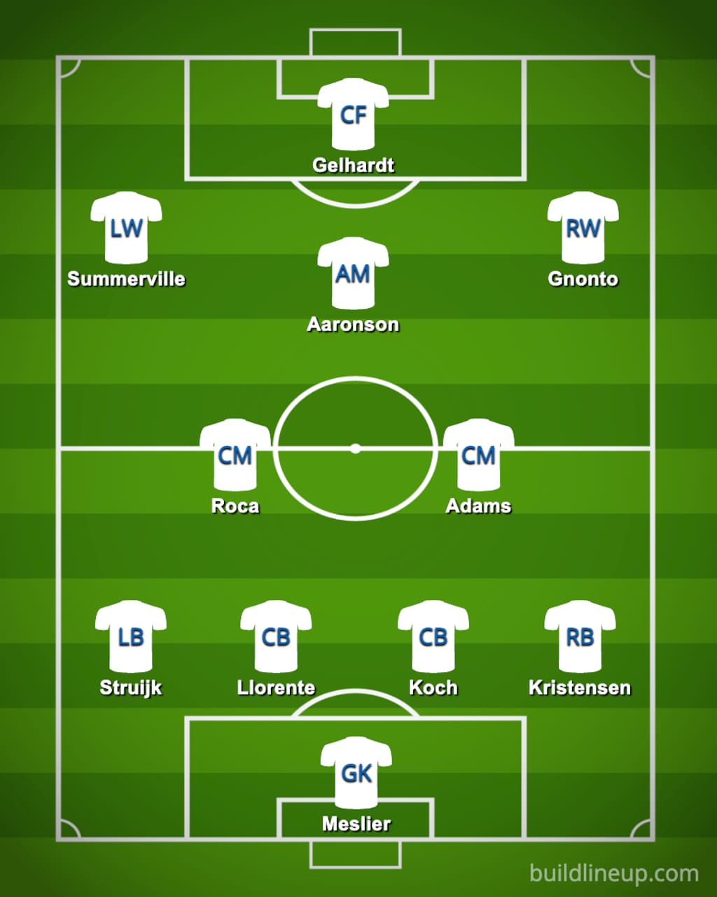 With summer signing Luis Sinisterra out as well, Joel Gelhardt, Crysencio Summerville, Brenden Aaronson, and the impressive Wilfried Gnonto should all keep their places along the front four as the American manager looks to continue to tap into youthful exuberance as part of his plan to avoid relegation.