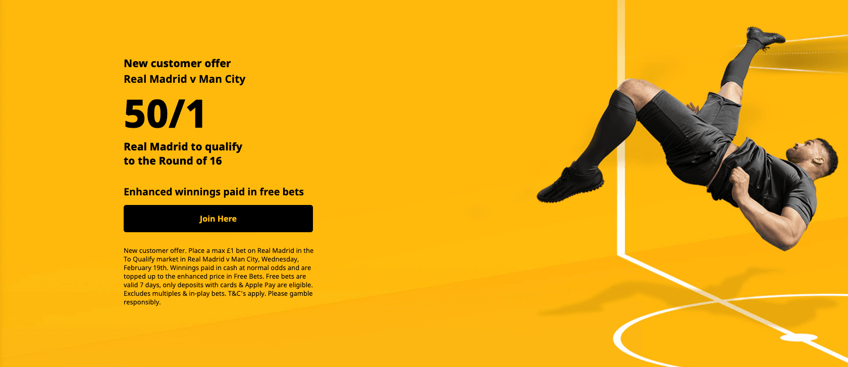 - Place a max £1 bet on Real Madrid in the To Qualify market in the UEFA Champions League match Real Madrid v Man City on Wednesday, February 19th.