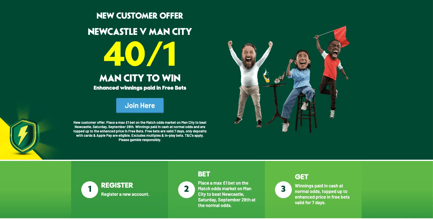 - Place a max £1 bet on the Match odds market on Man City to beat Newcastle in the English Premier League match on Saturday, September 28th.