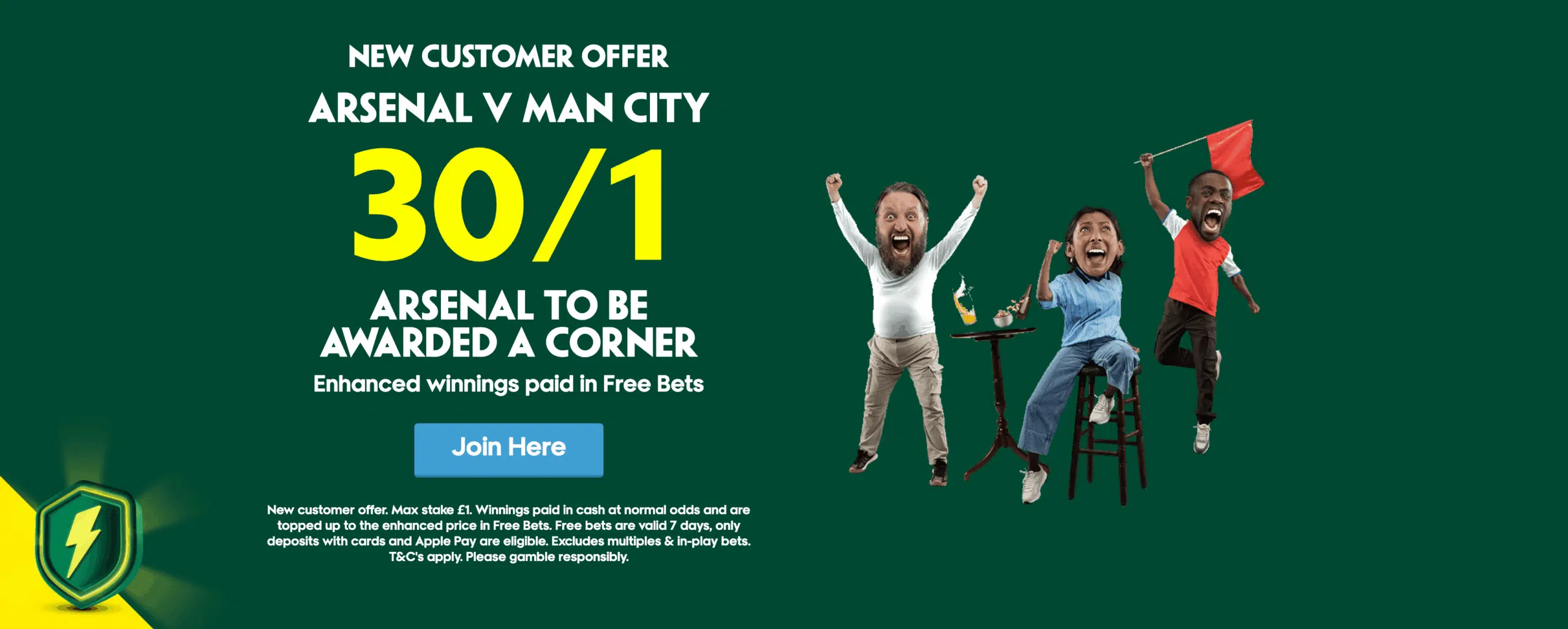 Paddy Power Enhanced Welcome Offer – Get 30/1 On Arsenal To Be Awarded A Corner vs Man City
