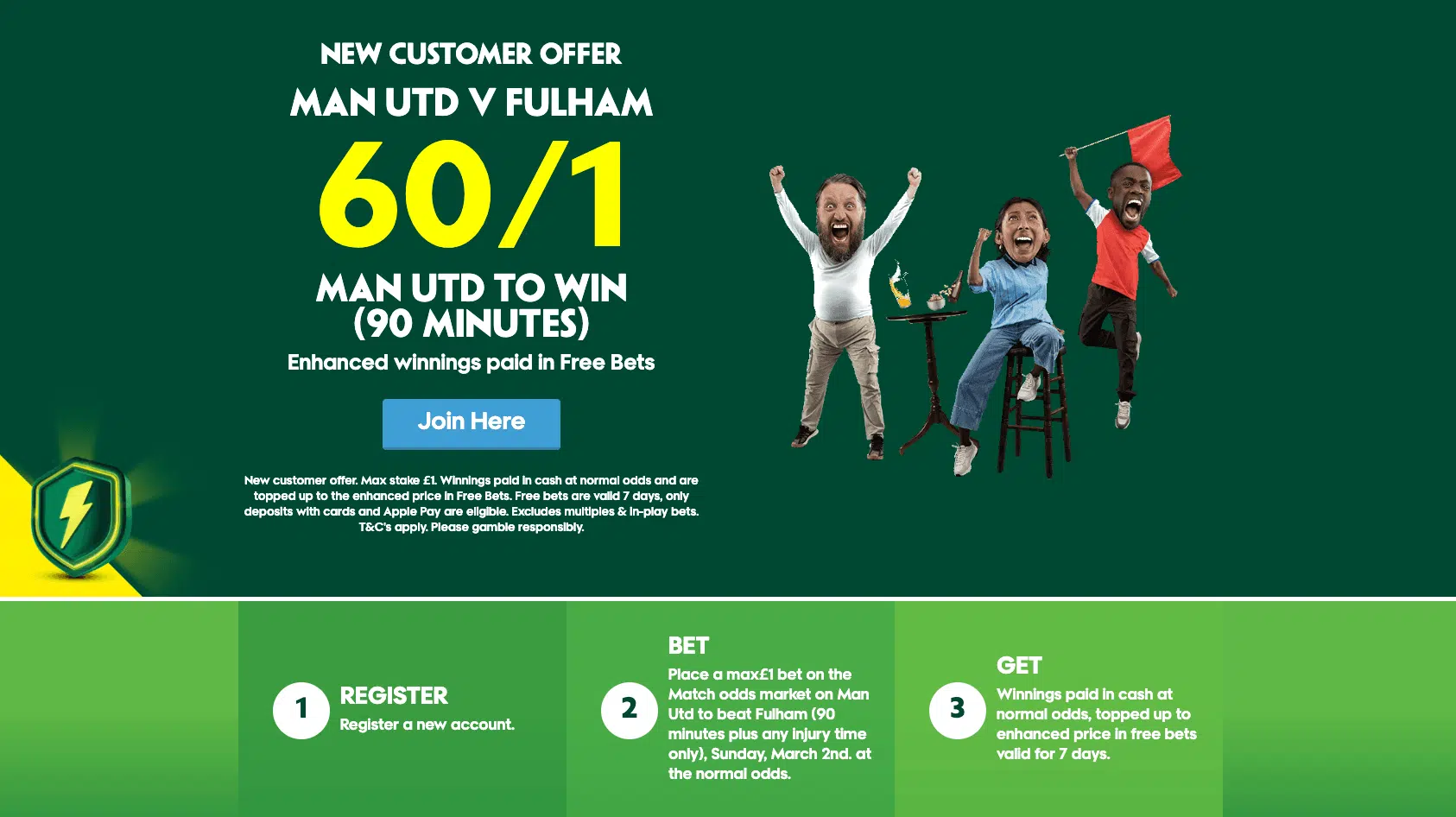 - Place a max £1 bet on the Match odds market on Man Utd to beat Fulham (90 minutes plus any injury time only) in the English FA Cup match on Sunday, March 2nd.