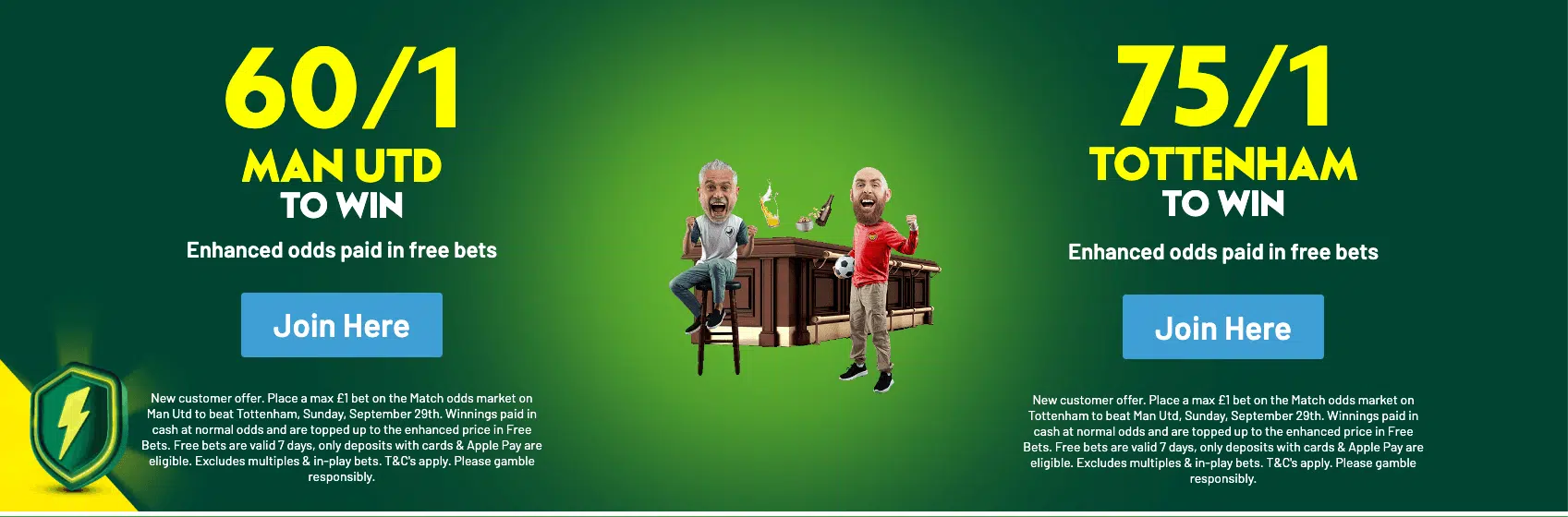 - Place a max £1 bet on the Match odds market on Tottenham to beat Man Utd, Sunday, September 29th