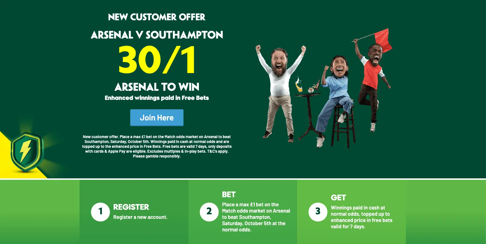 - Place a max £1 bet on the Match odds market on Arsenal to beat Southampton, Saturday, October 5th.