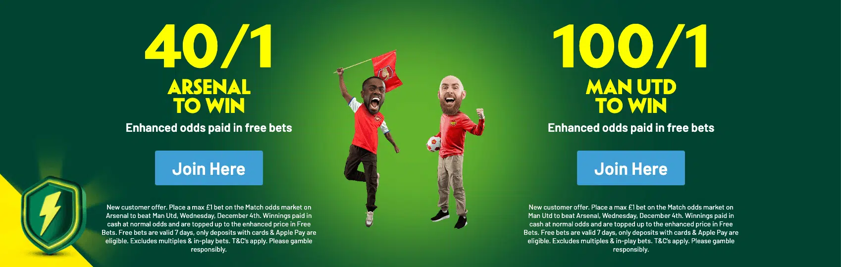 - Place a max £1 bet on the Match odds market on Arsenal to beat Man Utd in the English Premier League match on Wednesday, December 4th..