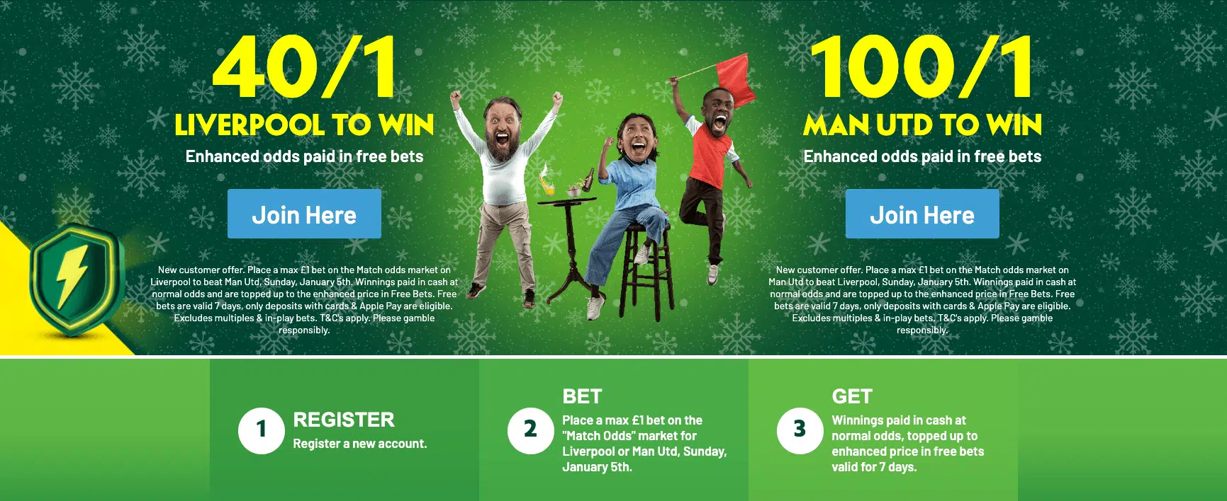 - Place a max £1 bet on the Match odds market on Man Utd to beat Liverpool, Sunday, January 5th.