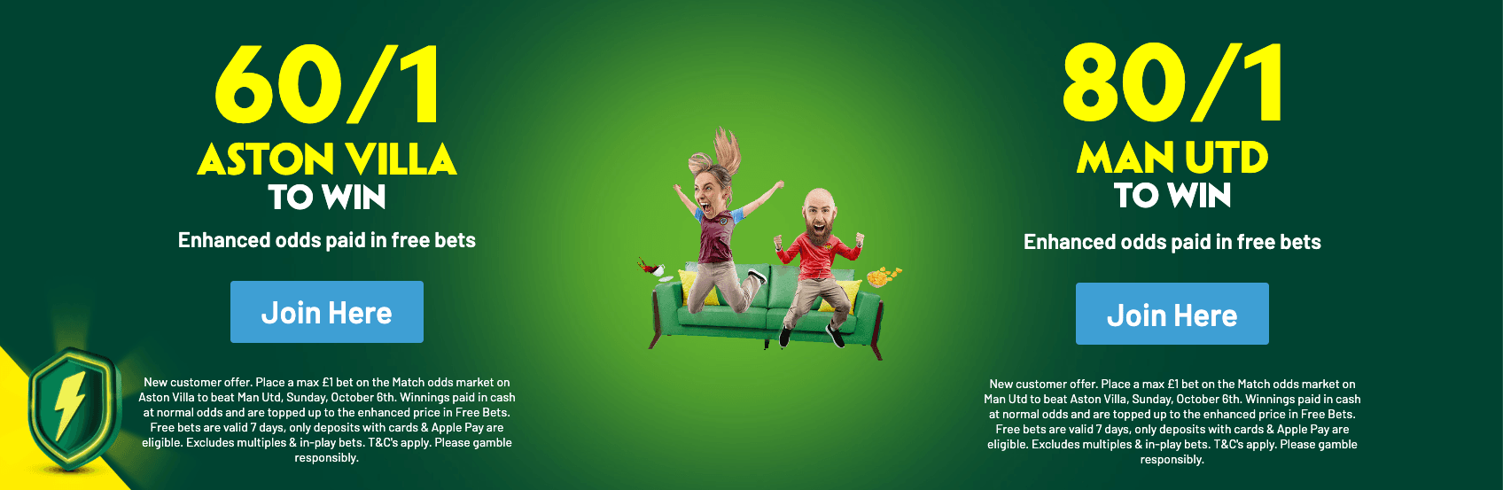 - Place a max £1 bet on the Match odds market on Aston Villa to beat Man Utd, Sunday, October 6th.