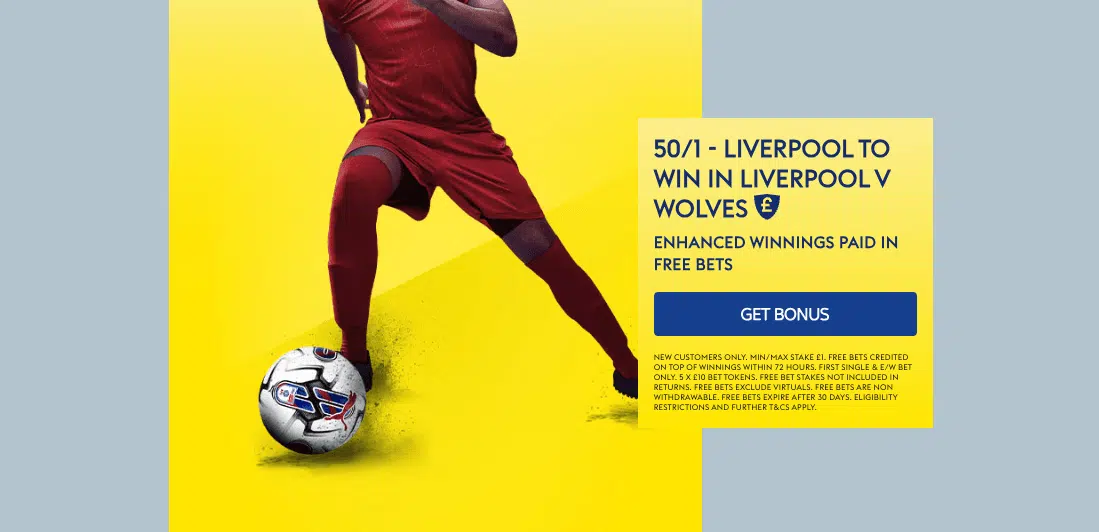 - In order to qualify for this promotion, new customers must sign up through the Enhanced Price Boost welcome offer, make a minimum deposit of £5, and place a bet of £1 (the “Staking Requirements”) as their first bet on “Liverpool to Win” in Liverpool vs Wolves (the “Bet”) at enhanced odds of 50/1..