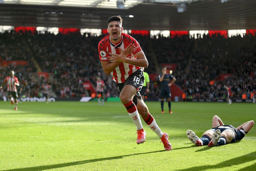 Editorial Use Only – DataCo restrictions apply Armando Broja celebrates after scoring a goal to put his side 2-1 ahead in Southampton v Burnley, Premier League, St Mary’s Stadium, Southampton, UK – 22nd October 2021 (Alamy Stock Photo)