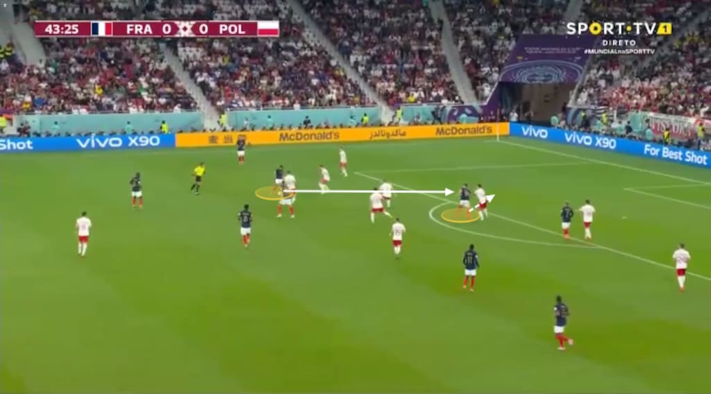 As already mentioned, Theo Hernandez gets forward a lot from left back to allow Kylian Mbappe to thrive more centrally, as his pass map from the round of 16 win over Poland shows.