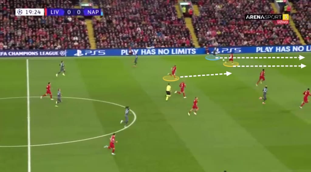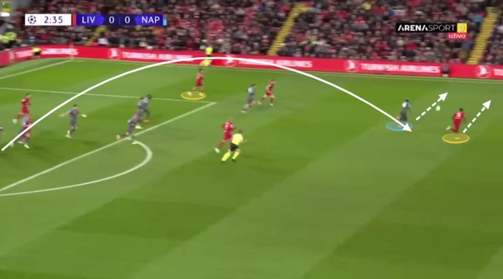 However, the Frenchman is quick to get across and close the space down left by TAA. Virgil van Dijk, meanwhile, has Victor Osimhen covered on the right of the pitch, which he did well all evening.