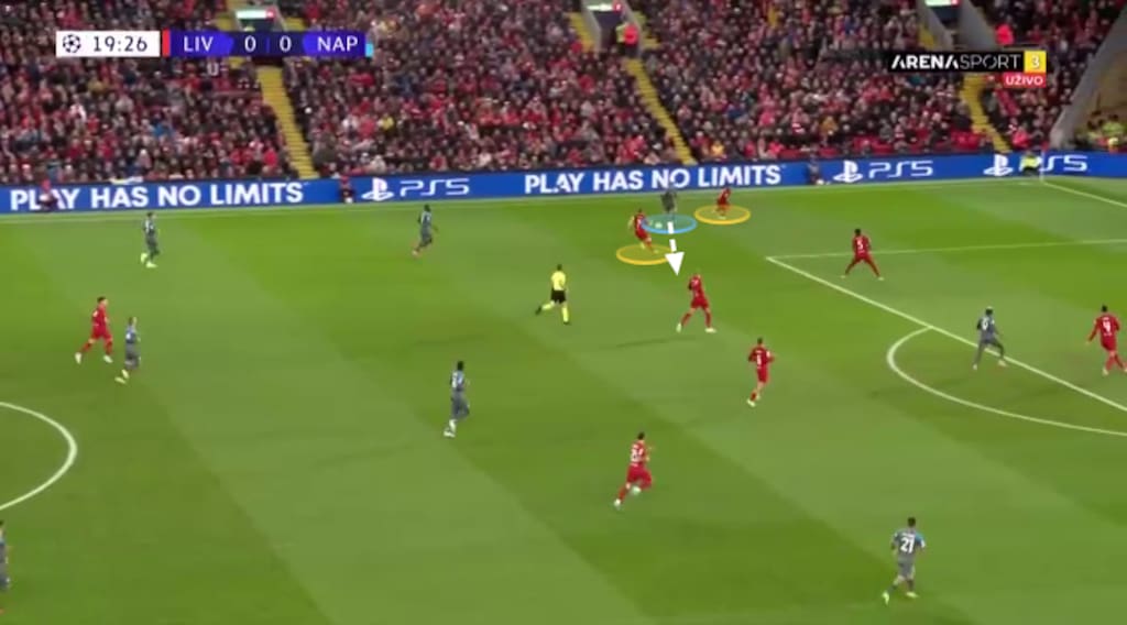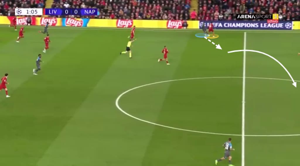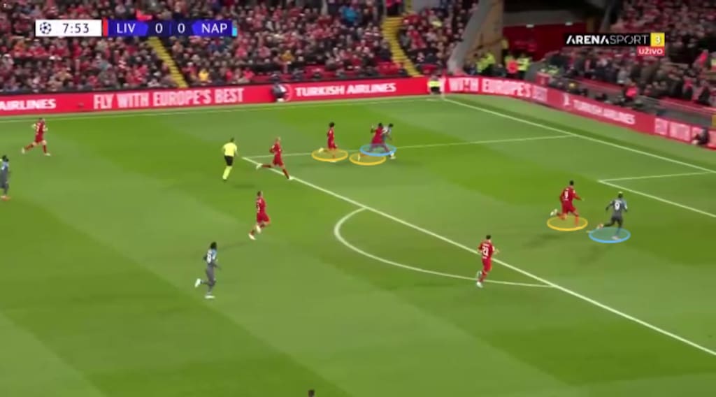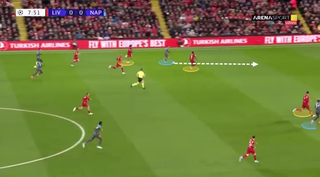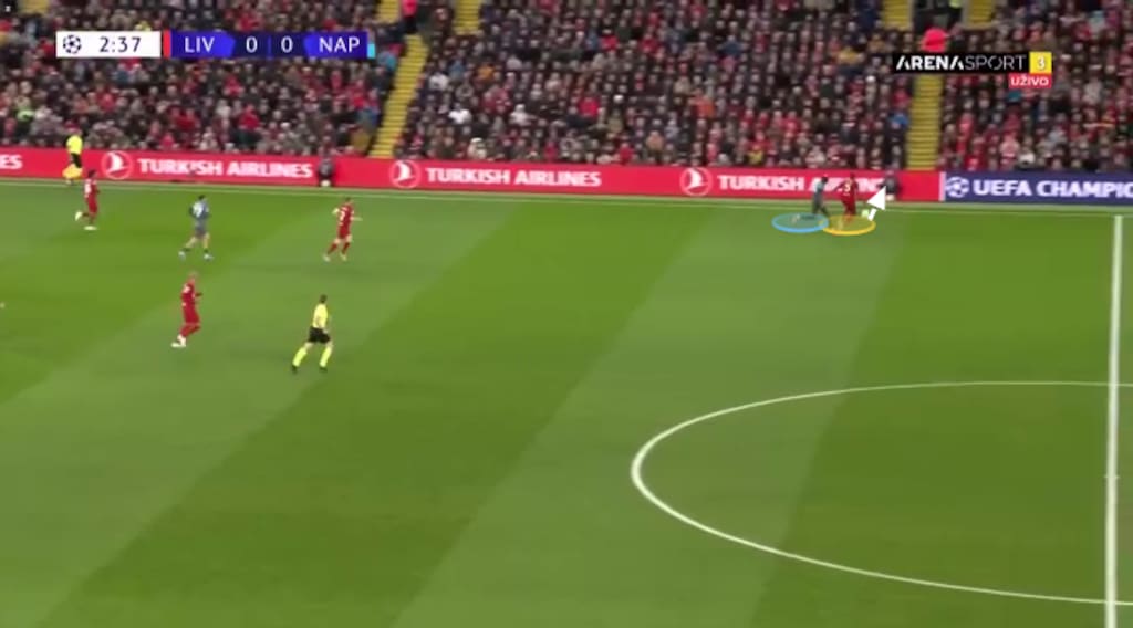 Just minutes into the game, the ball is cleared from the Napoli box to Liverpool’s right-hand side.