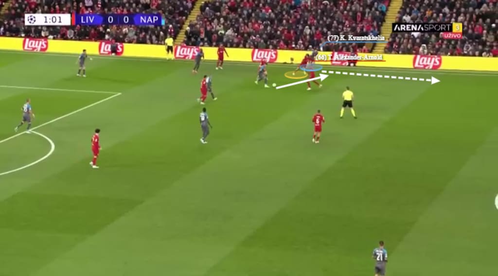 In this clip, the ball is played to Kvaratskhelia and he is 1v1 with Trent.