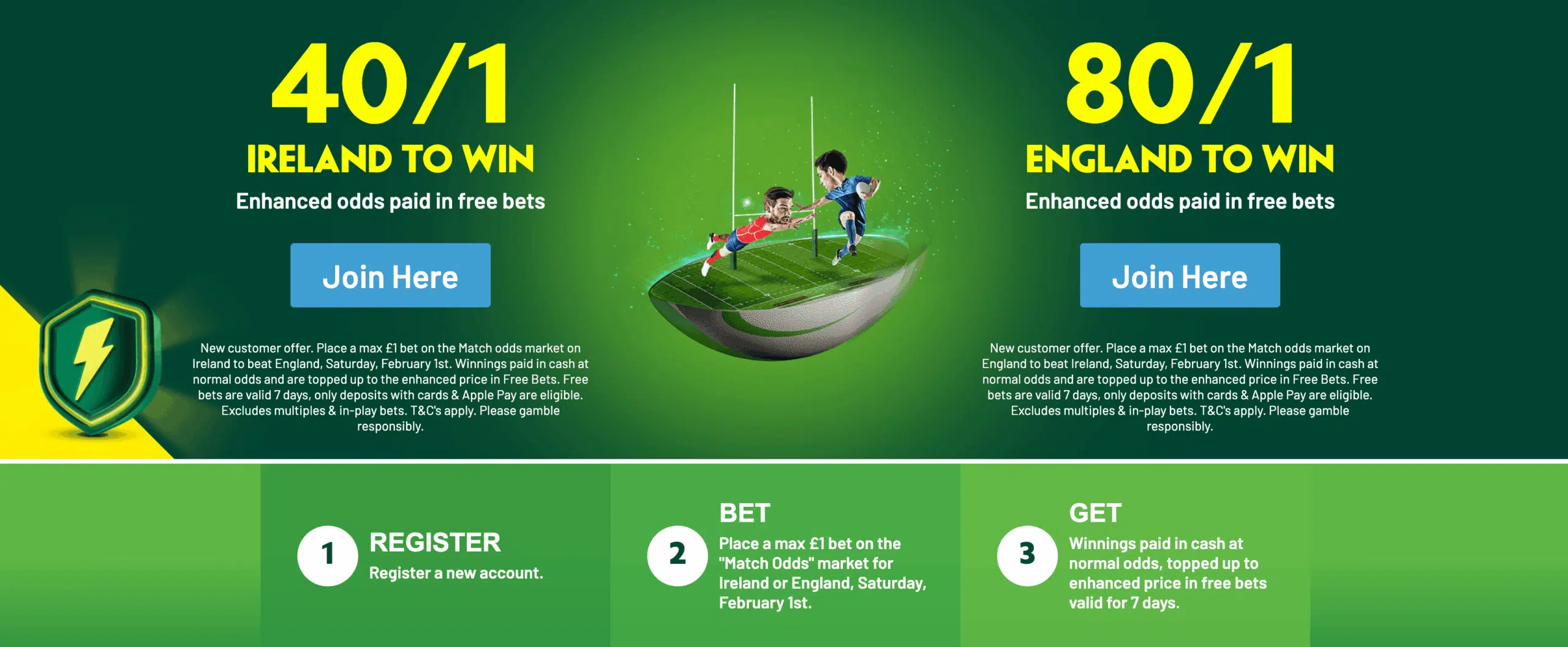 - Place a max £1 bet on the Match odds market on Ireland to beat England in the Six Nations match on Saturday, February 1st.