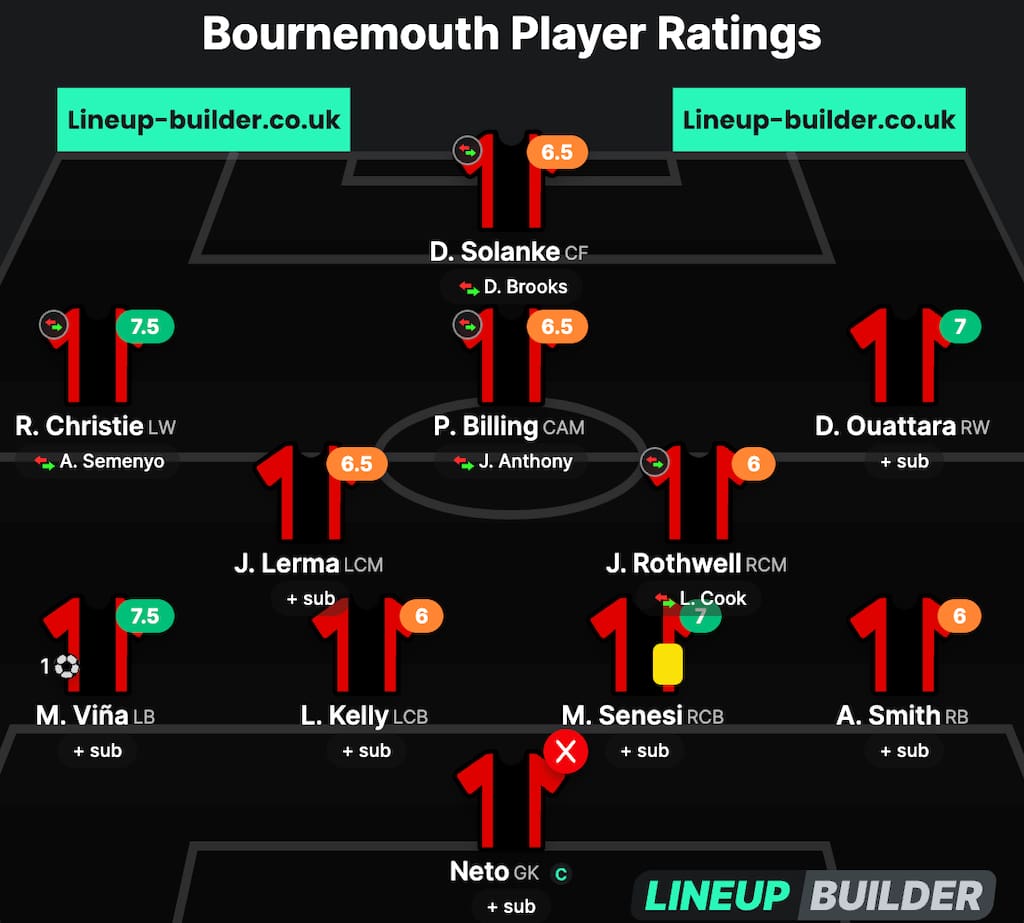 The scoreline coming into the halftime interval would end up reflecting what was an even affair across ninety minutes after Cherries left-back Matías Viña found an equalizer in the 21st minute after a lovely bit of simple-touch football presented the Uruguayan international with enough space to hit a bending effort past Kepa Arrizabalaga into the far post top corner.