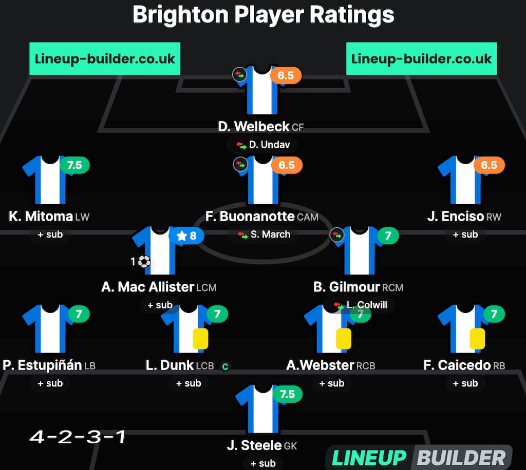 In-demand midfielder Alexis Mac Allister’s late penalty sealed all three points for Roberto De Zerbi’s Seagulls as their dreams of European nights at the AMEX continues